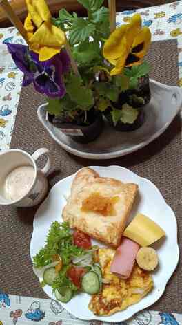 パンジーを見ながら朝食です。パンには、家で作ったかりんジャムをのせました。抜群に美味しいです。コーヒーでいただきます