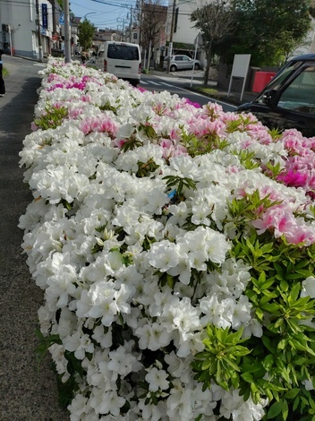 側道のつつじが満開で綺麗です。
