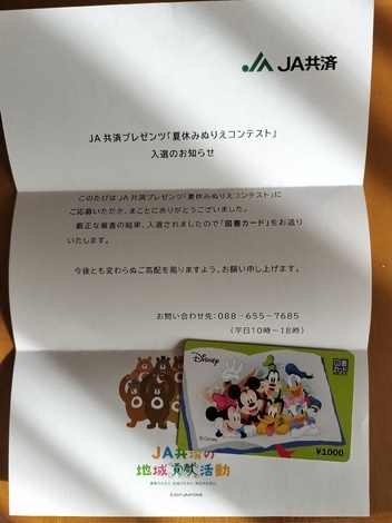 孫がJAのぬりえで入選。図書カード1000円もらいました👍私のアプリから応募✨