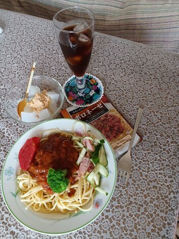 納豆チーズトースト、アイスカフェオレ、ミカン