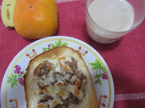 大好きな納豆チーズトースト、アイスカフェオレ、柿、バナナ