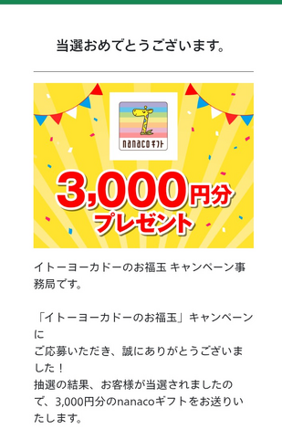 あとヨーカドーのキャンペーンでナナコギフト3000円など当たりました✌