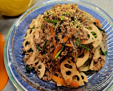 チャプチェをあるもので自己流で作ったのですが、どこかで春雨を戻さずいれるという記事を見ていたのでやってみたら、ホントにできて、今までいちいち茹でていたので、なるほど!って思いました🐭🎈