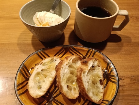 バケット🥖にバターたっぷり落ち着く朝食ですね😊