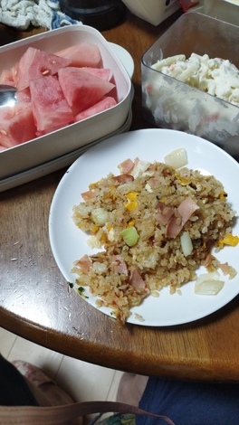 夕食は 炒飯 マカロンサラダ 甘く無い🍉 炒飯 崩れた😓