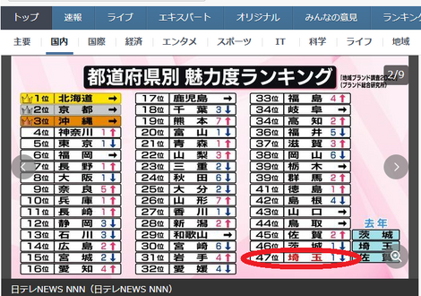 埼玉はなんと 不本意の最下位...なぜ?(Yahoo!ニュースより)