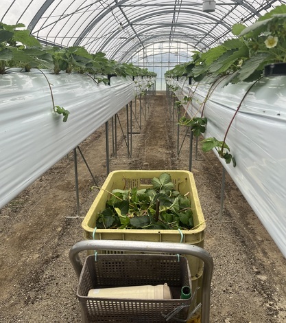 ハウスの中で苗の葉切りしています。