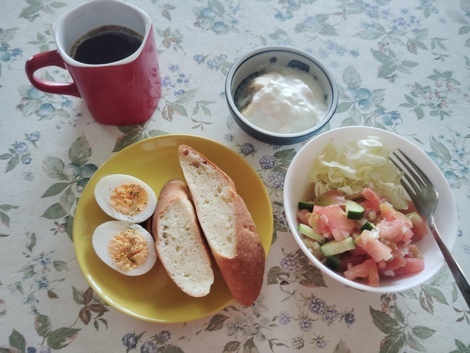 フランスパン、トマトとキュウリのサラダ、茹で卵、バナナヨーグルト。