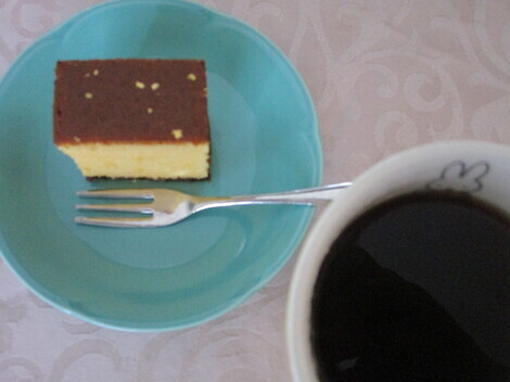 日光のお土産「金粉入り」カステラとブラックコーヒーでした