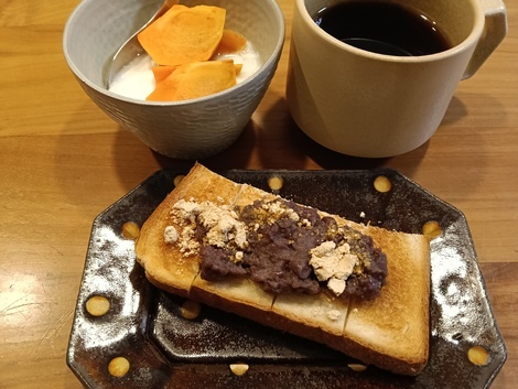 今朝も粒あんときな粉トースト(^^)和スイーツ風って美味しいですね〜❤️ヨーグルトには実家の柿inでした。
