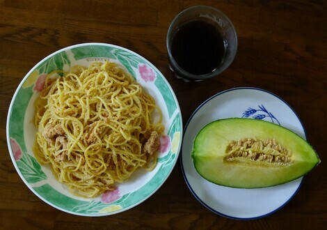 ブラックを飲みながら明太子パスタとメロンを食べました