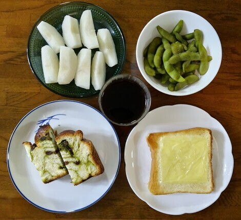 ブラックを飲みながらチーズパン、枝豆、梨などを食べました