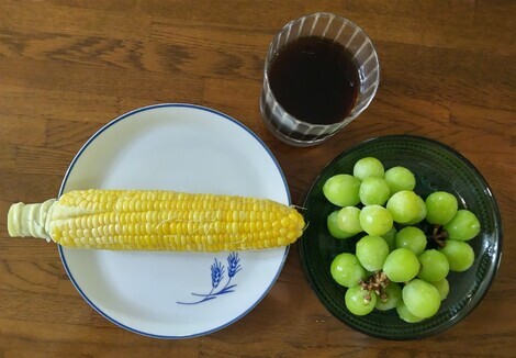 ブラックを飲みながらトウモロコシとシャインマスカットを食べました