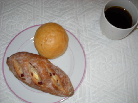 クリームチーズとラズベリーのカンパーニュとプチパンとコーヒーで。