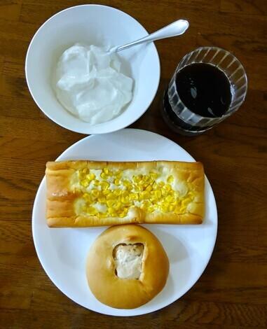 ブラックを飲みながらコーンとツナのパン、ヨーグルトなどを食べました