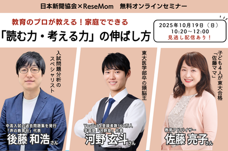 新聞協会は10月19日(日)、保護者向けオンラインセミナーを開催します。最新の入試動向や家庭での対策を頭脳王・河野玄斗さん、過去問分析のプロ・後藤和浩さん、3男1女東大合格・佐藤亮子さんに聞きます。