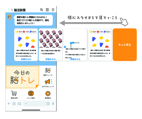 脳トレ問題は家族や友人と競って取り組むと、脳活だけでなく、会話のきっかけにもなると大変好評です。そのほか、旅をテーマにした特別コンテンツや脳活新聞オリジナル商品用クーポンやプレゼント情報も配信中。生き生きとした毎日のために、ぜひさまざまな便利機能を役立ててください。