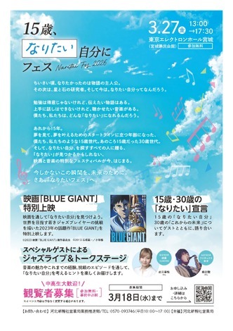 中高生の夢を応援する「15歳、なりたい自分にフェス」が3月27日(金)午後1時~5時半、宮城県仙台市の東京エレクトロンホール宮城で開催されます。主人公の宮本大が世界一のジャズプレーヤーを夢見て努力する映画「BLUE GIANT」の特別上映や、元AKB48メンバーで俳優の岩田華怜さんとプロサックス奏者の熊谷駿さんによるトークショー、スペシャルライブなど、中高生の夢を応援するプログラムになっています。