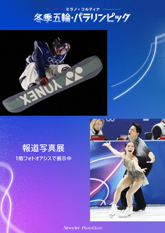 ミラノ・コルティナ五輪・パラリンピックの選手の活躍の瞬間を捉えた写真展が、東京・汐留の共同通信社本社1階の「フォトオアシス」で開催中です。