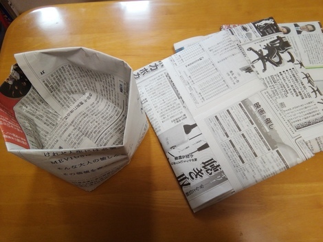 新聞紙を2枚重ねにして折って三角コーナーがわりにしてます。