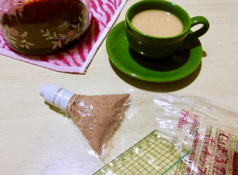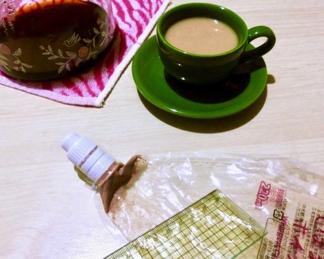 定規で押し出しています♪テレビを見ながらコーヒーを飲みつつホイップを出し切る♪(吸うw)