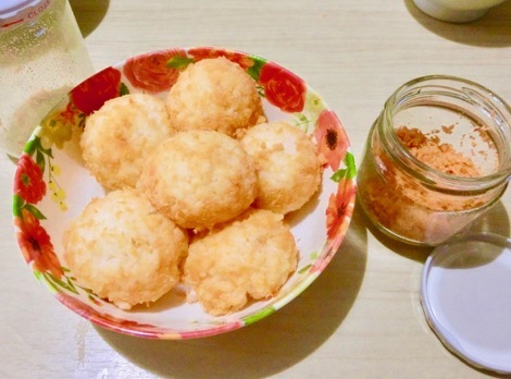 薄力粉にきんぴら作った時のたれ(おつゆ?)を加えて溶き、マヨネーズをちょい足し(卵の代わり)して衣を作りました。