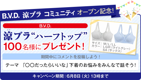 ただいま、「B.V.D. 涼(スズ)ブラ コミュニティ」では、オープン記念キャンペーンを実施中です!