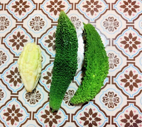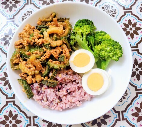 ひき肉と収穫した2種類のゴーヤを利用した味噌炒めをご飯にのっけました。