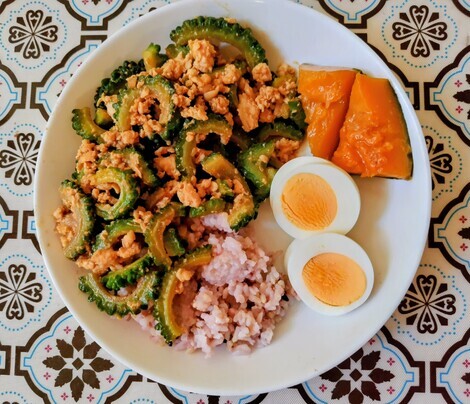 ゴーヤとひき肉の味噌炒めをご飯にのっけました。