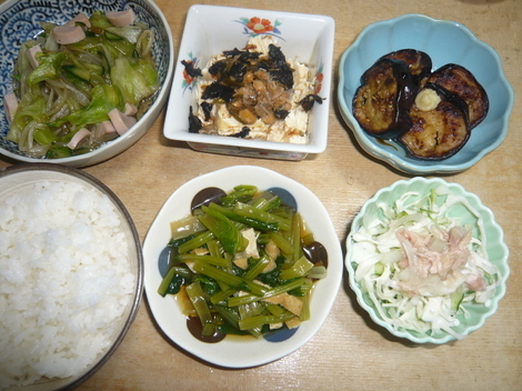 レタスソーセージ炒め、焼きナス、ツナサラダ、小松菜油揚げ、納豆めかぶ豆腐