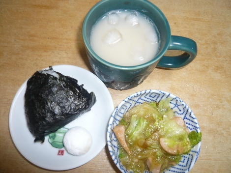 おにぎり、レタスソーセージ炒め、クッキー、豆乳ティー