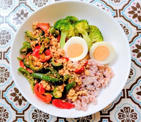 収穫した小さなゴーヤとピーマンのひき肉味噌炒めをご飯にのっけて食べました。