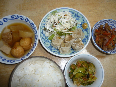 厚揚げつくね大根煮、胡瓜キムチ和え、大根金平、焼売サラダ、ご飯