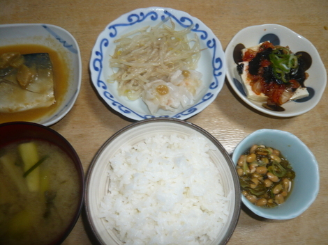 鯖味噌煮、エビ焼売、キムチ豆腐、めかぶ納豆、みそ汁、ご飯