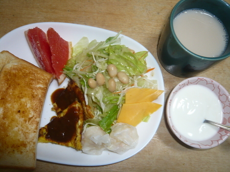 グレープフルーツ、サラダ、チーズ、エビ焼売、キノコ卵焼きカレーソース、トースト、ヨーグルト、豆乳
