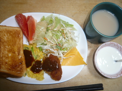 グレーフルーツ、サラダ、チーズ、メンチ、スペインオムレツ、トースト、ヨーグルト、豆乳ティー