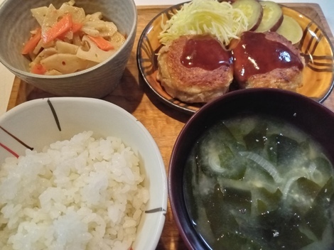レンコンのきんぴらとわかめの味噌汁。