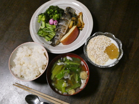 今朝は、ブロッコリー・かき菜(家庭菜園)、しそニンニク、ニシン、小ねぎの酢味噌和え、リンゴ、オートミールと柚子ジャムを入れたヨーグルト、ネギとかき菜の味噌汁でした😋