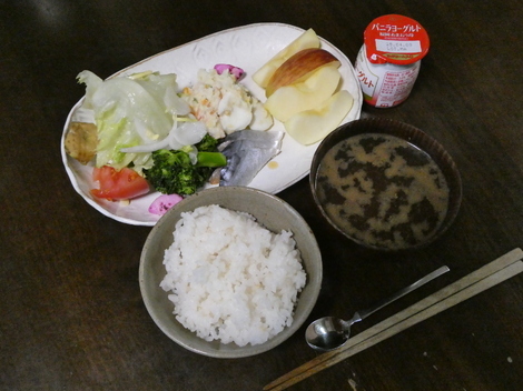 今朝は、野菜サラダ、ブロッコリー、ポテトサラダ、しめ鯖、しそニンニク、リンゴ、イチゴ味のヨーグルト、しじみの味噌汁でした😋