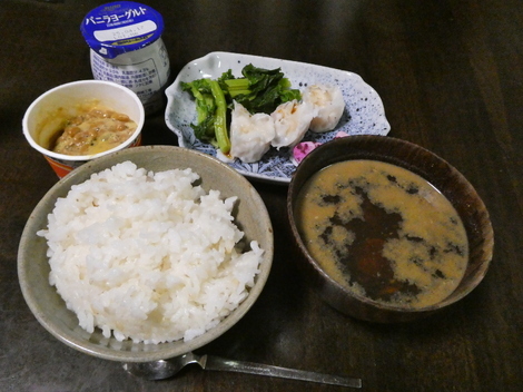 今朝は、ヨーグルト、納豆、かき菜、シュウマイ、しそニンニク、しじみの味噌汁でした😋