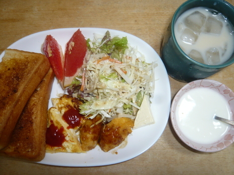 グレープフルーツ、サラダ、チーズ、チキンカツ、スペインオムレツ、トースト、ヨーグルト、豆乳ティー