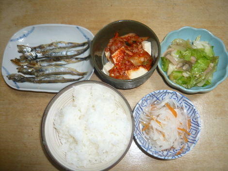 シシャモ焼き、なます、シーセージ野菜炒め、キム