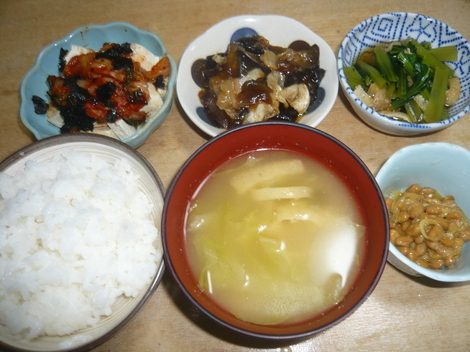 キムチ奴、納豆、茄子みそ炒め、小松菜油揚げ煮びたし