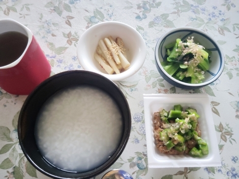 粥、オクラ納豆、酢ごぼう、茹で小松菜を食べました。