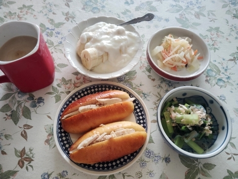 胸肉のサンドイッチ、酢キャベツ、茹で小松菜、バナナヨーグルトを食べました。
