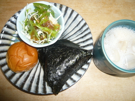 鮭のおにぎり、アンパン、サラダ、豆乳