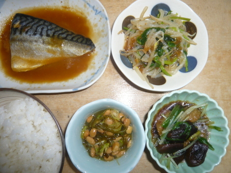 鯖味噌煮、もやしほうれん草のナムル、めかぶ納豆、茄子と水菜のめん