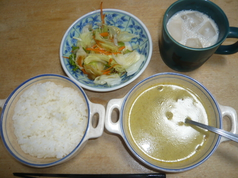タイ風グリーンカレー、ご飯、サラダ、ミ