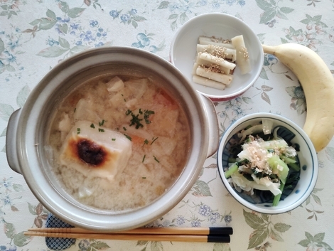 雑煮、茹で小松菜、酢ごぼう、バナナ