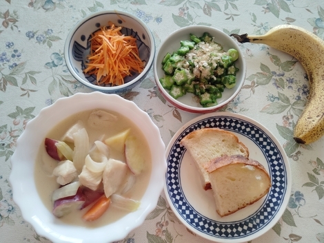パン、さつまいものシチュー、オクラ、キャロットラペ、バナナ